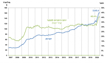 למרות המשבר הכלכלי בגלל הקורונה, יתרות מטבע החוץ של ישראל נמצאות בנתוני שיא. היתרות בספטמבר אומנם ירדו ב-1.1 מיליארד דולר, ל-160.58 מיליארד, יחסית לחודש הקודם, אך הן עלו ב-41.12 מיליארד שקל, שהם 34.41%, לעומת השנה עברה, ושמהווים 40.4% מהתוצר המקומי.