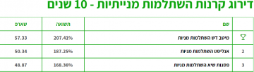 אז מי מובילה בדירוג? כפי שניתן לראות בטבלה, קרן ההשתלמות המנייתית של מיטב דש מובילה את הדירוג ל-10 שנים. מדובר בתקופה ממושכת ולכן יש בביצועים האלו כדי לספק אינדיקציה חשובה על יכולת ניהול ההשקעות של הקרן.