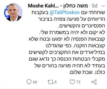 קצבאות הפננסיה לא יפגעו ובטח שלא קצבאות הזקנה. כפי שהגדלנו במיליארדים את התקציבים לקשישים מקבלי הבטחות הכנסה כך נדאג שגם בעתיד לא תהיה פגיעה בהורים של כולנו. שבת שלום."