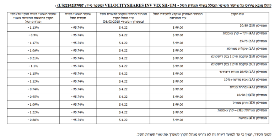 "מנהל הקרן מתכבד להודיע על קביעת שווי של תעודת סל, המוחזקת בקרנות שלעיל (להלן: "הקרנות"), עקב שערוך תעודת הסל בסיום המסחר על ידי מנהל תעודת הסל", מסבירים באפסילון, "לאור זאת, ובהתאם להנחיות דירקטוריון מנהל הקרן ולבחינה שערך בהקשר, קבע מנהל הקרן את שווייה של תעודת הסל האמורה כמפורט בקובץ המצ"ב. כמו כן, מפורטים בקובץ האמור שיעורי השינוי בשווי הנקי של נכסי הקרן כתוצאה מקביעת השווי כאמור. למען הסדר, יצוין כי עד למועד דיווח זה לא נדרש מנהל הקרן לשערך את שווי תעודת הסל". משפט קצת תמוה המשפט האחרון – שערכתם או לא, אנחנו מניחים שכן למרות שלא היתה דרישה מהרגולטור. כך או אחרת, תעודת הסל שאפסילון הפסיד עליה כמעט את כל ההשקעה היא XIV תעודת סל שהתרסקה ביום אחד (אחרי המסחר) מ-99 דולר ל-4.22 דולר.