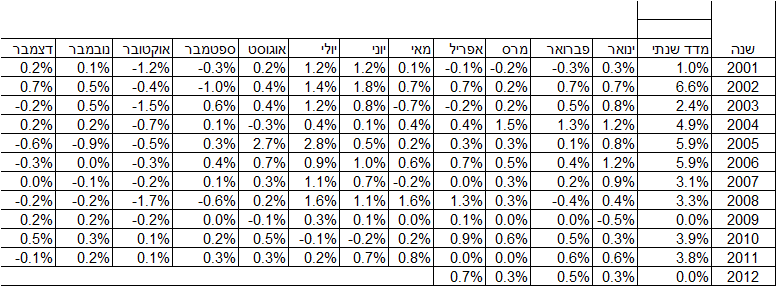 אתר הון, מדריכים פיננסים עוקב בהתמדה אחרי פרסום המדדים השוטפים ובנוסף מספק תחזיות על ביצועי המדד בחודשי הקרובים. הפעם בחרנו לספק לכם נתונים על המדד משנת 2001 ועד 2012. חשוב לשים לב, המדד הזה עולה משמעותית על מדד המחירים לצרכן, וזו "בעיה" לרוכשי דירות מקבלן שמחוייבים לשלם לקבל על פי הצמדה למדד תשומות הבנייה. מה עושים? אפשר במגרת המו"מ לנסות לקבע כהצמדה את מדד המחירים לצרכן, לפעמים זה מצליח, ואפשר לנסות להפחית עד כמה שניתן את הנזק – אם אתם צופים שהמדד יהיה משמעותית מעל ריבית המשכנתא אולי ניתן לשלם מוקדם יות ר(ולקחת משכנתא בהתאמה מוקדם יותר) – כאן, יש שיקולים שהם לא בהכרח כלכליים, אבל בזוויית הכלכלית זה יכול להיות משתלם.