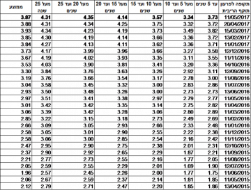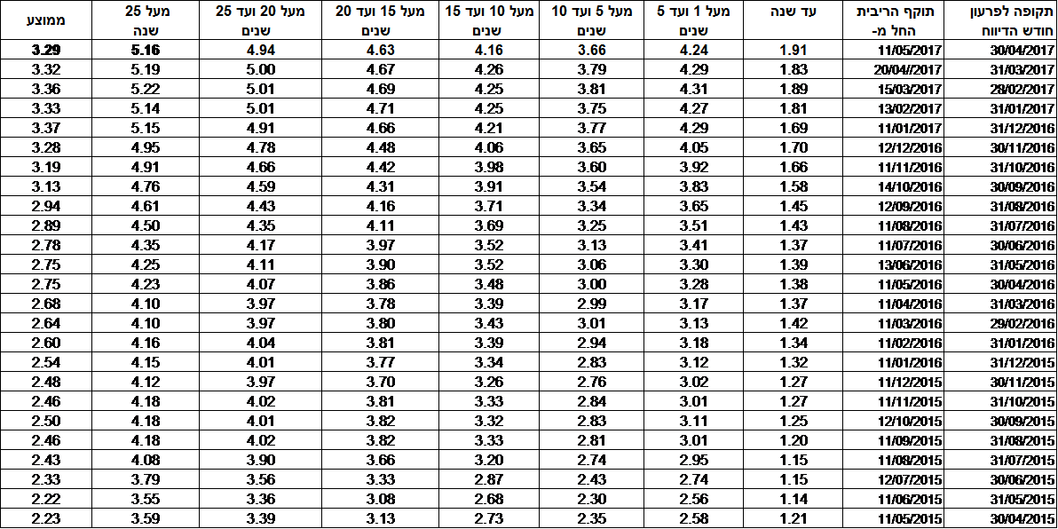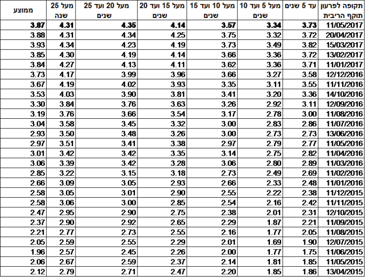 ריבית המשכנתא הממוצעת הצמודה למדד לתקופה של 15 עד 20 שנה ירדה ל-4.14% לעומת 4.25% בחודש הקודם והריבית על משכנתאות לתקופה של 20 עד 25 שנה עלתה ל-4.36%, לעומת 4.34% בחודש הקודם. הריבית הצמודה למדד מבטאת עלות כוללת של כ-5%-6% בשנה. מדד המחירים לצרכן בהתאם לטוואי שהגדיר בנק ישראל צפוי לעמוד על 1% עד 3% בשנה. להלן טבלה המרכזת את ריבית המשכנתא לטווחים שונים בשנתיים האחרונות –