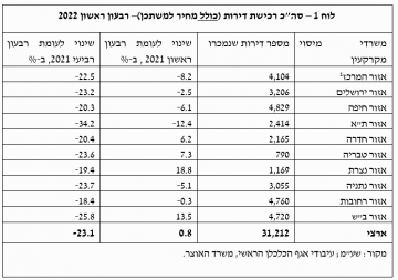 רכישות המשקיעים ברבעון הראשון השנה הסתכמו ב-5,000 דירות,  ירידה של 26% בהשוואה לרבעון המקביל אשתקד וירידה חדה של 60% לעומת רמת השיא שנרשמה ברבעון האחרון של 2021,  זאת לאחר העלאת מס הרכישה בסוף נובמבר אשתקד. שיעור ירידה זה דומה לשיעור הירידה שנרשם ברכישות המשקיעים ברבעון שלאחר העלאת המס הקודמת ביוני 2015.