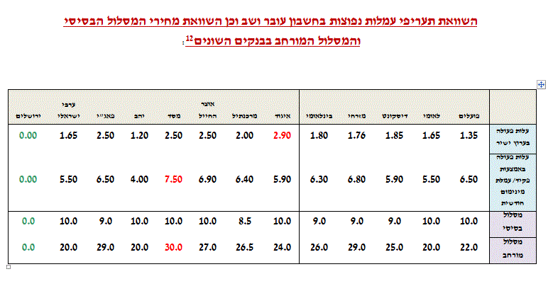 – בכלל המערכת הבנקאית, ההוצאה החודשית הממוצעת לחשבון בבנק ירושלים היא הזולה ביותר (כ- 0.7 ש"ח) ובבנק פאג"י היא היקרה ביותר (כ- 22.5 ש"ח).