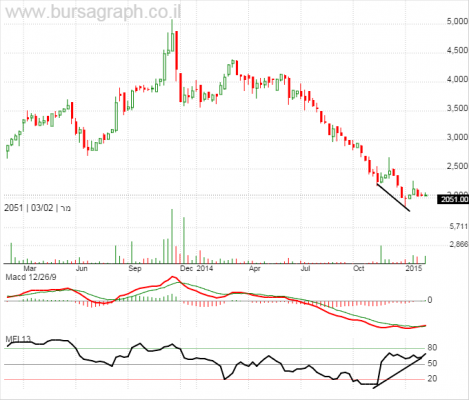כפי שניתן לראות בגרף השבועי, מבחינה טכנית המניה קרסה משער שיא של 5,075 בסוף 2013 לשער שפל של 1832 בסוף 2014, ירידה של 64%. בגרף עצמו נראים מספר סימנים מעודדים המצביעים על כך שיתכן ומגמת הירידה קרובה לסיום. קיימת סטייה שורית בולטת בין גרף המחירים למתנד המחזור (שפלים יורדים בגרף המחיר לעומת שפלים עולים במתנד המחזור). במקביל ה- MACD סיפק איתות לונג עם חציית העקומה המהירה את העקומה האיטית. בגרף המחירים המבנה של מגמה יורדת נשמר (שיאים יורדים ושפלים יורדים) ולכן רכישה של המניה הינה לתוך מגמת ירידה, מהלך שמנוגד למסחר מגמה מבוסס ניתוח טכני. למרות זאת, כאשר מנסים לצוד שפלים יש להבין כי ניתן להפסיד בטווח הקצר ולכן האסטרטגיה המתאימה היא רכישה במספר מנות (רצוי מנות הולכות וגדלות על מנת למצע את מחיר הקנייה הממוצע למחיר נמוך ככל האפשר). מכיוון שאזור התמיכה הבא הוא 1500 ניתן לרכוש במנות מדודות החל משער 2000 (אזור המחיר הנוכחי) ולמקם סטופ לכל הכמות בסגירה מתחת לשער 1500.