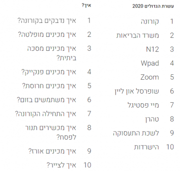 כמובן שבשל משבר הקורונה הביטויים הקשורים מקבלים ביטוי נרחב במדד, כאשר הם ריכזו את מרבית העניין ברשימת "עשרת החיפושים החמים של השנה" ודחקה החוצה מהעשירייה הפותחת נושאים בולטים שבשנה "רגילה" תופסים את תשומת הלב כמו מערכת הבחירות בישראל והבחירות בארה״ב. המושג קורונה מדורג במקום הראשון ברשימה ומשרד הבריאות במקום השני. השלכות המגפה באות לידי ביטוי בחיפושים נוספים, ביניהן: בנקום הרביעי נמצא "WPAD", פרוטוקול אבטחה לעבודה מרחוק, אפליקציית שיחות הווידאו "זום" במקום החמישי, שירות המשלוחים "שופרסל און ליין" במקום השישי ולצערנו "לשכת התעסוקה" במקום התשיעי בעקבות מאות אלפי ישראלים שיצאו לחל"ת או פוטרו במהלך השנה.