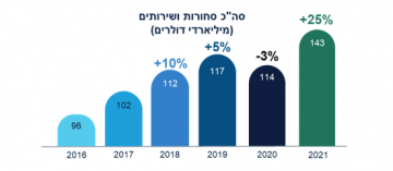 קצב הגידול הגבוה ניכר הן בסחורות וביתר שאת בשירותים עם שיעורי גידול חסרי תקדים בראייה היסטורית. הסחורות צמחו בשיעור של 17% לעומת שנת 2020 – זאת בהשוואה לסטגנציה מסוימת בשנים האחרונות. לעומתם, השירותים צמחו בקצב כפול – 34%. קצב הגידול חריג בגובהו גם בהשוואה לגידול הממוצע של סקטור השירותים בשנים האחרונות.