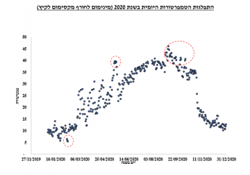 בגרף המצורף, ניתן לראות את הטמפרטורות היומיות המינימליות (בחודשי החורף) והמקסימליות (בחודשי הקיץ) בשנת 2020 .ערכי הטמפרטורות המשפיעים על שיאי הביקוש מסומנים בעיגול מקווקו.