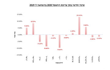 מהשוואה חודשית של צריכת החשמל בשנת 2020 לעומת 2019 המוצגת בגרף מטה, ניתן לראות את הירידות בביקוש לחשמל שהחלו בחודש מרץ כתוצאה מהקורונה ואת הגידולים בחודשים ספטמבר ואוקטובר הנובעים בעיקר משינויי מזג האויר. שיא הירידות היו ברבעון השני של השנה. באותו רבעון ירדה צריכת החשמל במשק ב-5.6% לעומת הרבעון השני אשתקד. בחודש נובמבר ניכרת התאוששות משמעותית שהתבטאה בירידה של 8.1% בלבד בצריכת החשמל הנובעת מהפעילות הכלכלית במשק, לעומת ירידה של 6.9% בשיא השפעת הקורונה.