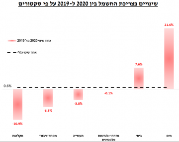 בחלוקה לסקטורים, ניתן לראות כי כל המגזרים, למעט המגזר הביתי והמים, חוו ירידה בפעילות הכלכלית כתוצאה מהקורונה, בהשוואה לשנת 2019 .המגזר הביתי עלה לעומת 2019 בשל הסגרים ומעבר לעבודה מהבית ומגזר המים בשל השאיבה המוגברת עקב כמות המשקעים הרבה בשנת 2020.