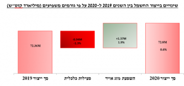 בשורה התחתונה, ייצור החשמל בשנת 2020 עלה בכ-6.0% בהשוואה לשנת 2019. העלייה בייצור מורכבת מעליה של כ-9.1% הנובעים מאירועי האקלים הקיצוניים בעיקר בקיץ ובעונות המעבר, וירידה של כ-3.1% הנובעים מההאטה במשק כתוצאה מהקורונה והסגרים האחרונים.