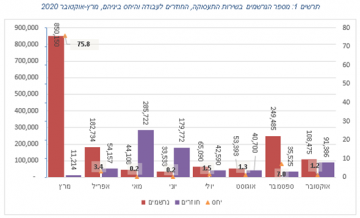 מהדו"ח עולה כי בתחילת חודש אוקטובר 2020, מספר דורשי העבודה הפעילים בשירות התעסוקה נשק למיליון (995.7 אלף), בשיאו השני של גל הנרשמים בשירות התעסוקה. על רקע השינוי שחל בשבועיים האחרונים של החודש, בעקבות כניסתן לתוקף של הקלות על המשק שהשפיעו על חלק מהענפים, המספר הצטמצם והגיע בסוף החודש ל-940.3 אלף. 63.6% מתוכם, שהם 597.9 אלף דורשי ודורשות עבודה, רשומים עקב חל"ת (לעומת 65.3% בסוף ספטמבר).