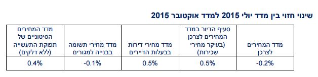 כלכלני הראל פיננסים צופים כי מדד תשומות הבנייה יירד בחודשים אוגוסט עד אוקטובר. על פי התחזית האחרונה של בית ההשקעות, הירידה במדד תשומות הבנייה תעמוד על 0.1% בחודשים שבין יולי 2015 לבין אוקטובר 2015.