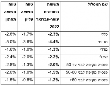 להערכת אבי ברקוביץ, משנה למנהל השקעות ראשי מיטב דש גמל ופנסיה, קופות הגמל וקרנות ההשתלמות הכלליות הגדולות יציגו בפברואר 2022 תשואה נומינלית (ברוטו) ממוצעת שלילית של 0.7%. תשואה צפויה זו מייצגת גם את התמונה בתעשייה כולה, כאשר טווח התשואות של כלל הקופות אמור לנוע במנעד של בין תשואה שלילית של 0.3% לבין תשואה שלילית של 1.2%. העליות שנרשמו בימים האחרונים חסכו למשקיעים תשואה שלילית נוספת של יותר מ-1%. הביצועים השליליים של הקופות והקרנות בפברואר באים לאחר שגם בינואר רשמו הגופים האלה תשואה ממוצעת שלילית, כך שבסיכום ינואר ופברואר מסתכמת תשואת קופות הגמל במינוס 2.3%.