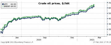 מצוין כי "מחיר הנפט מסוג BRENT עלה מכ-62.11 דולרים לחבית בסיום יום המסחר ב-19/2/2021 לכ-64.43 דולרים לחבית בסיום יום המסחר ב-26/2/2021 ומחיר חבית מסוג WTI עלה מכ-59.24 דולרים לחבית בסוף המסחר ב-19/2/2021 לכ-61.50 דולרים לחבית בסיום יום המסחר ב-26/2/2021."