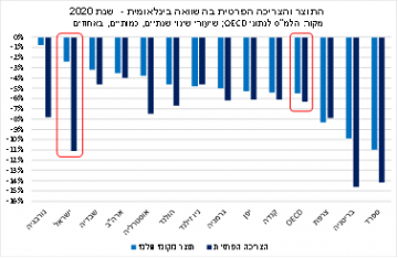 בשנת 2020 התוצר המקומי הגולמי של ישראל התכווץ ב-2.4%, והפתיע לטובה ביחס להערכות המוקדמות