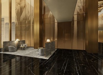 בכל מגדל יוקם טרקלין עסקי רחב ומעוצב בגובה 7 מטרים. הלובי שיוקם, בגובה 13 מטרים, במעין אקווריום זכוכית הכולל חנויות מסחר ו 26 מעליות. על עיצוב השטחים הציבוריים – לובי הזכוכית המפואר בגובה 13 מטר וטרקלין העסקים הענק, אמון מעצב העל האיטלקי, ג'יורג'יו ארמני. הטרקלין "תלוי" בין שמיים וארץ ויאפשר צפייה פנורמית לפיאצת גבעון, מתחם הטמפלרים בשרונה, מרכז תל-אביב ועד הים.
